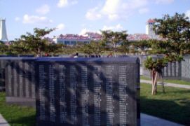 9月に沖縄と言えば台風が心配だが、運よく飛行機が飛ぶ日は台風は沖縄と成田の真ん中、足摺岬沖にあり、この台風を避けるために30分ほど遅れて那覇空港に着いただけで、無事に沖縄の土を踏むことができた。この夏できたばかりの沖縄・戦後初の鉄道のモノレール『ゆいレール』に乗り込む。すでに3時近く、今日は沖縄南部の平和の礎(いしじ)だけを訪れようと思っている。この平和の礎、第二次大戦末期、ここ沖縄で戦死したほとんどすべての人の名が石碑に刻まれている場所である。多くの民間人を含む沖縄の人たちが亡くなった大半だが、本土から沖縄戦に参加しなければならなかった人々や、敵国米英の人々、台湾、韓国、北朝鮮の人々もふくまれている。そして、ここには、私の祖父の名も刻まれている。那覇空港から一つ目の駅、赤嶺からバスを2本乗り継ぎ、ようやく、平和の礎に到着した。太平洋を一望する摩文仁の丘に、それはあった。24万人、聞きしに勝る、膨大な人々の刻銘である。私の祖父の名もあったが、どうにも信じられない気がした。放射状に石碑が並ぶ扇の中心にある平和の広場、そしてその中央に燃えている平和の火、その向こうに広がる太平洋。しばしここにたたずんだ。再び祖父の石碑の前に立つ。信じられないが、祖父はここ沖縄で亡くなった。ただの石碑に、小さく刻まれた名にすぎないが、それ以上の何かがあった。よくわからないが、ここを立ち去ることができない。なんだか、強く引きとめられる、こちらも帰りがたいような気分にさせた。