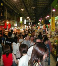 ホテルに着くと早速友人から呼び出しがかかる。県庁前の「パレット久茂地」というショッピングセンターで落ち合う。第一夜ということで、牧志の公設市場に連れていってくれた。雑多で古く、市場という雰囲気が出ている。エレベーターで2階に上がっていくあたり、ブダペストの中央市場を思い出させる。そこの2階にある食堂の1件でゴーヤちゃんぷるや、ソーミンちゃんぷるをつまみにオリオンビールを飲む。出てきた料理はイマイチさっぱりしすぎ、というか、ちゃんぷる(沖縄で「混ぜた」の意味)にも関わらず、ほとんど肉や野菜が混じっていない。友人も首をかしげて「これは違うな〜」と言っている。店を出て、私が出発前から熱望していた『大東寿司』を食べさせてくれるという大東そばの店へ行く。が、しかし、大東寿司は売り切れということで大東そばだけいただく。太めでコシが強く、かなり食べでがある。だしはさっぱりとしていて、おいしい。友人は「ちゃんぷるがイマイチだった!」私は「大東寿司が食えないなんて!」と言いながらも、今夜は日曜日、友人は明日も出勤なので「明日はもっと本格的な店にいこう」ということで、別れた(格安ツアー航空券なので、1泊はホテルがついている。明日は彼の家に泊まることになる)。